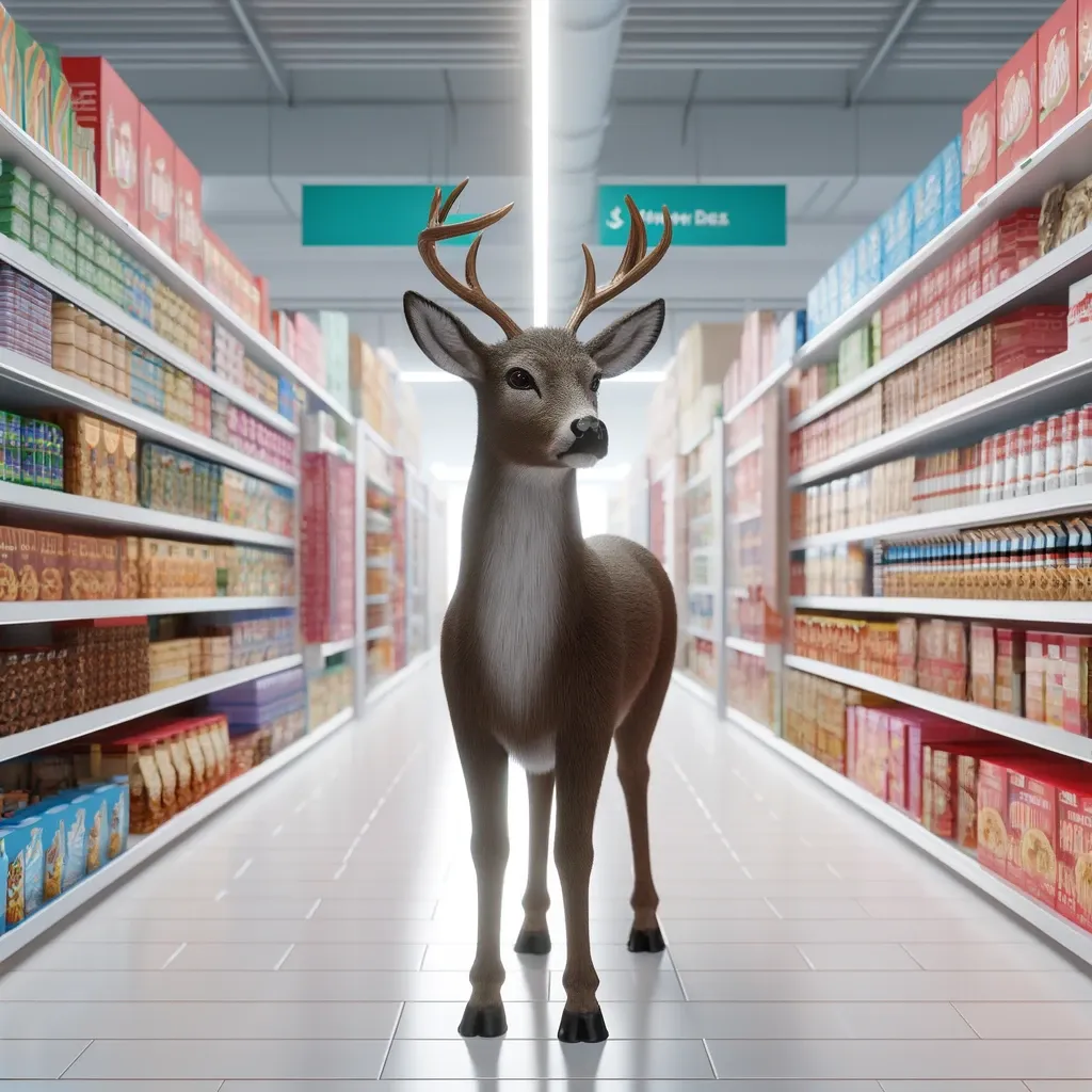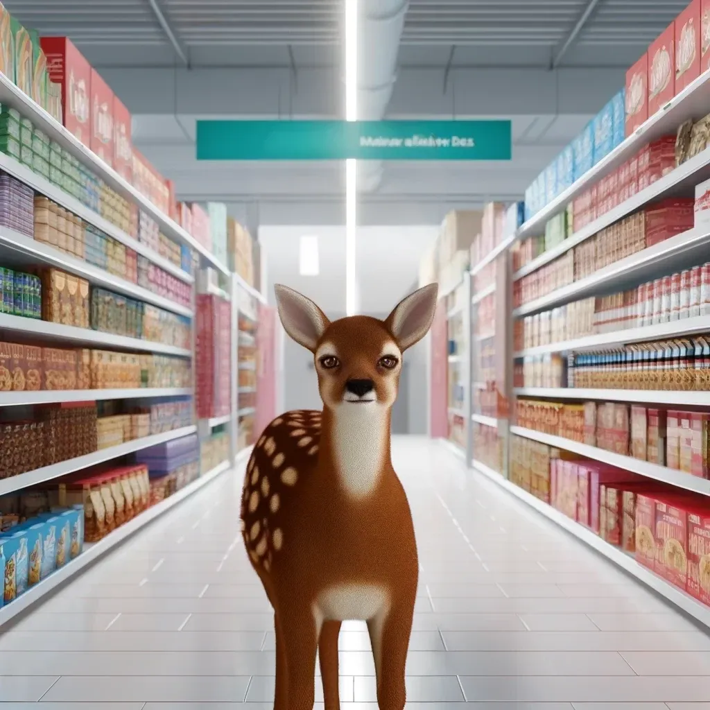 Image description: In the original image on the left, the deer looks a bit like a plastic mannequin, but fits lighting and shading wise with the rest of the grocery store scene. In the revised image on the right, the deer is now a fawn with strange flat shading, superimposed on the scene rather than standing in it. Its eyes are strangely liquid and 3D, but the rest of the fawn is staring straight on at the camera with no apparent depth. Where the grocery store aisle background has been revised, the shelves have lost all detail and resemblance to a grocery store, and the ceiling light fixture now descends into the floor.