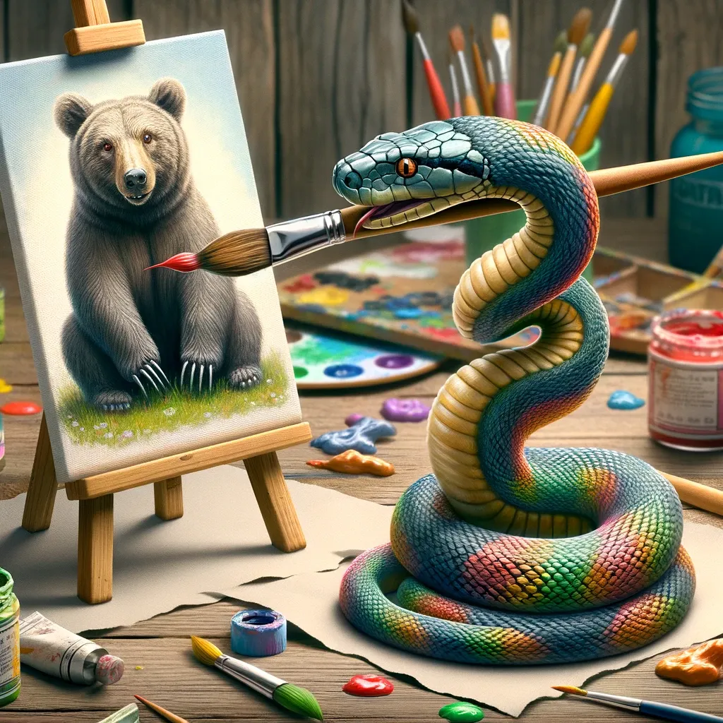 Image description: On the left, a rainbow-colored stake is coiled in font of an easel. (The snake's coil splits in two so I guess it's a fork-tailed snake). On the easel is a painting of a seated bear. It's fairly realistic. On the right, the bear has been replaced by a smaller, much worse, replica of the snake. There is no bear.