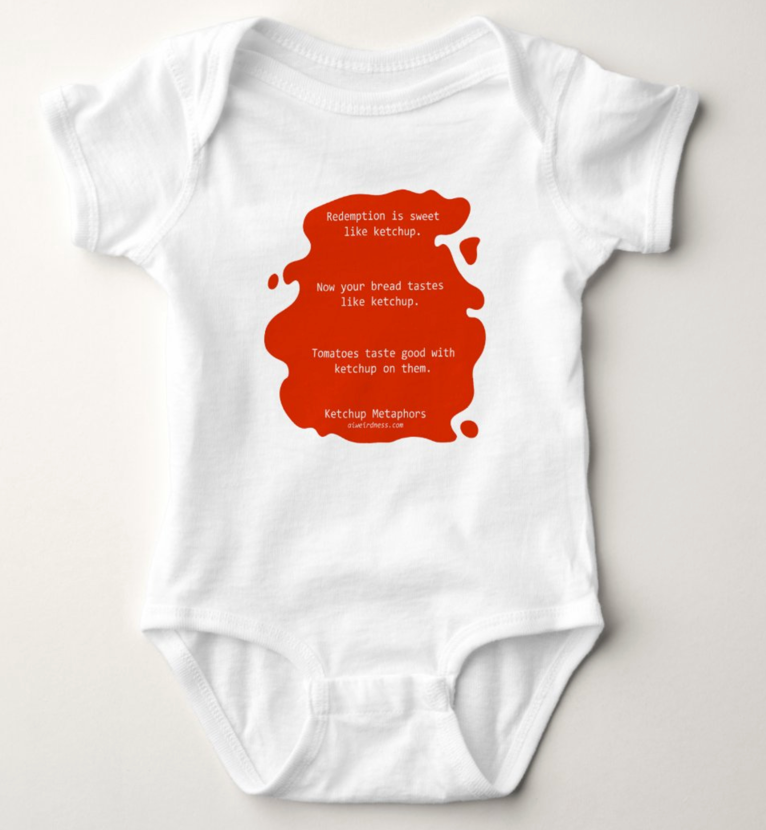 For the Ketchup Metaphors onesie the AI generated a few of the example ketchup metaphors to be printed on the shirt, including: