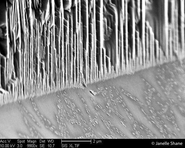 Microscopic fracture patterns appear clifflike on the edge of one of my samples. This entire view is less than 10 micrometers high, meaning that it covers about a tenth the thickness of a typical human hair. We usually don’t get patterns like these, because we use a special wafer dicing saw that uses a sharp blade to get a clean edge. But my notes on that particular sample say “expertly diced, i.e. dropped on the floor” so now we know where the interesting fracture pattern came from. "Floor dicing" does happen, especially when the samples get tiny and the grad student’s tweezer hand gets shaky. My labmates and I have learned that when working with a valuable sample, it’s best to limit multitasking, and to quit after the first signs of fatigue, or disaster will likely follow. On this particular test sample, the broken edge was no problem - I’d envisioned dicing the sample into rectangles, but jagged polygons would also work.