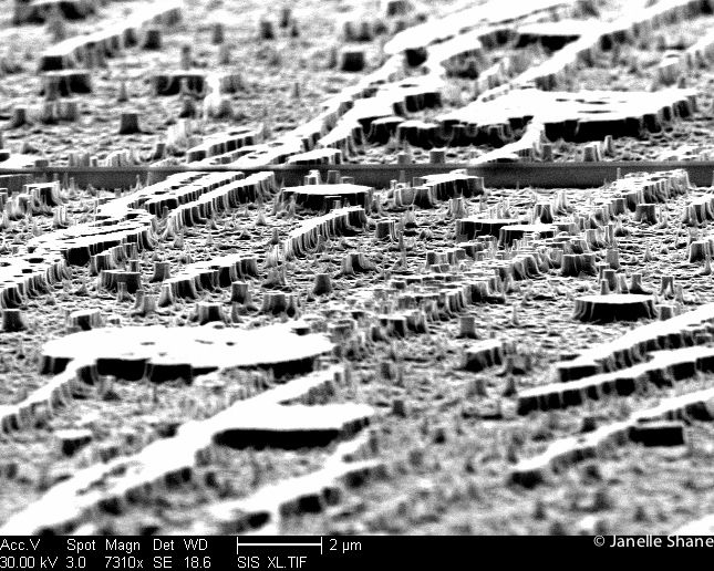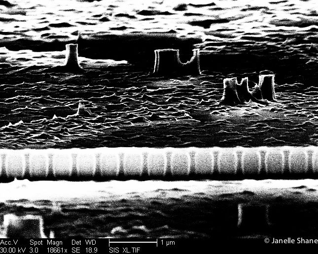 Well, the dark wall that spans the middle of the picture is actually supposed to be there - it’s supposed to guide infrared light (about 1.5um wavelength) from one end of a millimeter-long computer chip to the other. I’d masked that part off to protect it from the etching machine, so my etching process was supposed to produce just that and just nothing else. The rest of this crazy desert landscape is a sign that something went terribly wrong.