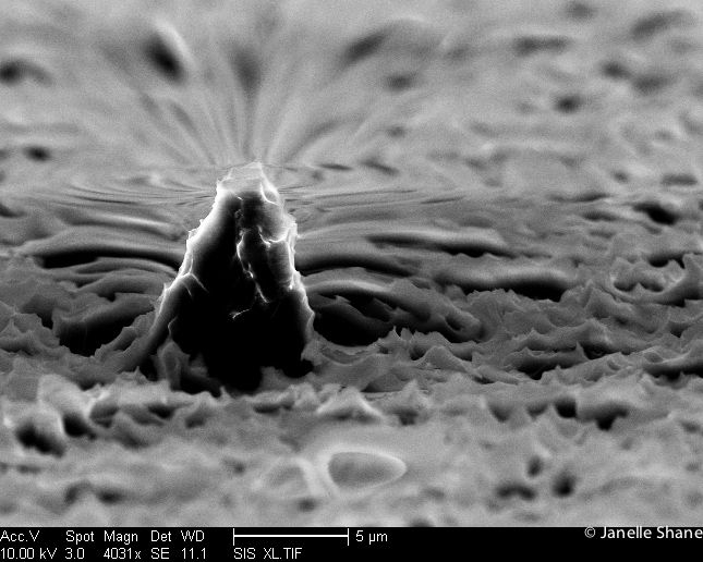 The Lonely Mountain, home to nanodragons. The surface of this sample is coated with a rough, mountainous substance - likely created when the top layer of my sample (a photoresist) didn’t hold up well to a reactive plasma that I was shooting at the sample. One bit of the rough surface juts up like a mountain above the rest, where it seems to bend space around itself. This phenomenon is known as charging, and happened when the mountain started accumulating enough negative charge from the scanning electron beam that it started repelling the electron beam itself.