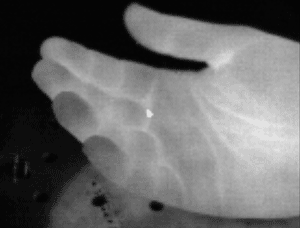 So this is my hand, which glows in infrared light because it’s hotter than the room around it. I’m spraying it with room-temperature water, which looks black in comparison because it’s a bit cooler. You can also see that the tips of my fingers are a bit cold (they’re darker than my palm). Below my hand is its reflection on a shiny metal table - metal mirrors work the same way in infrared as they do in visible light.
