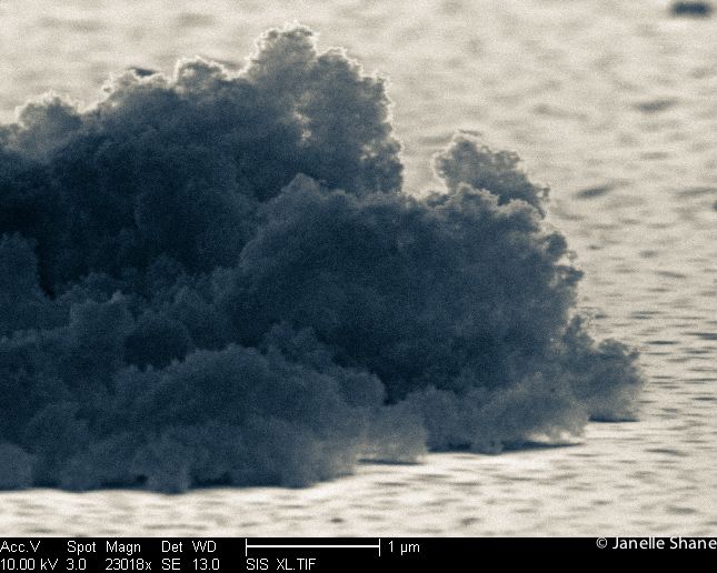 Extreme close-up of a single speck of dust. It turns out that dust comes in all shapes and sizes, and this cloud-shaped piece is a rarity - I’ve also found mountains and sails and lumpy monsters. None of which are supposed to be there… but when I take my samples out of the cleanroom to image them, I have to expect dust. This speck is small - the bar at the bottom of the image is only about 1/100 the width of a typical human hair.