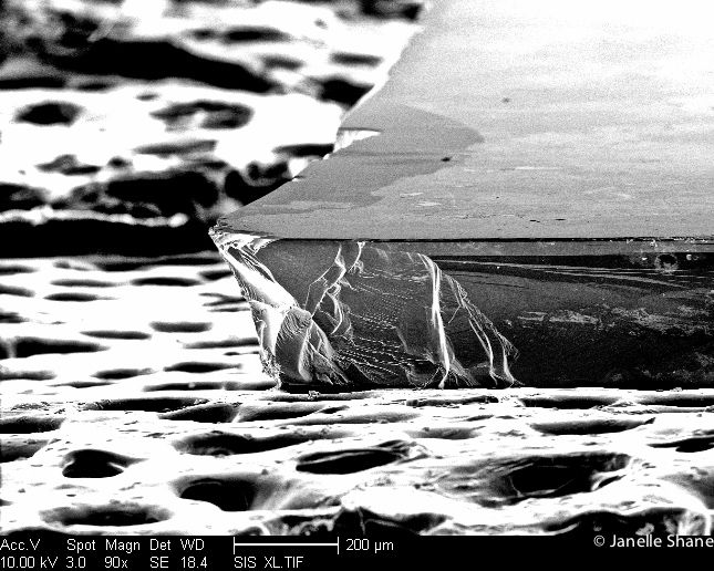 Typically, my samples are about 300 microns thick, which is about the thickness of three hairs stacked on top of each other, or slightly thinner than an extra-light guitar pick. In size they vary a lot - this one is about 0.5cm x 1cm. I’ve worked with smaller ones, but then they get difficult to handle with tweezers, and the risk of disaster greatly increases.