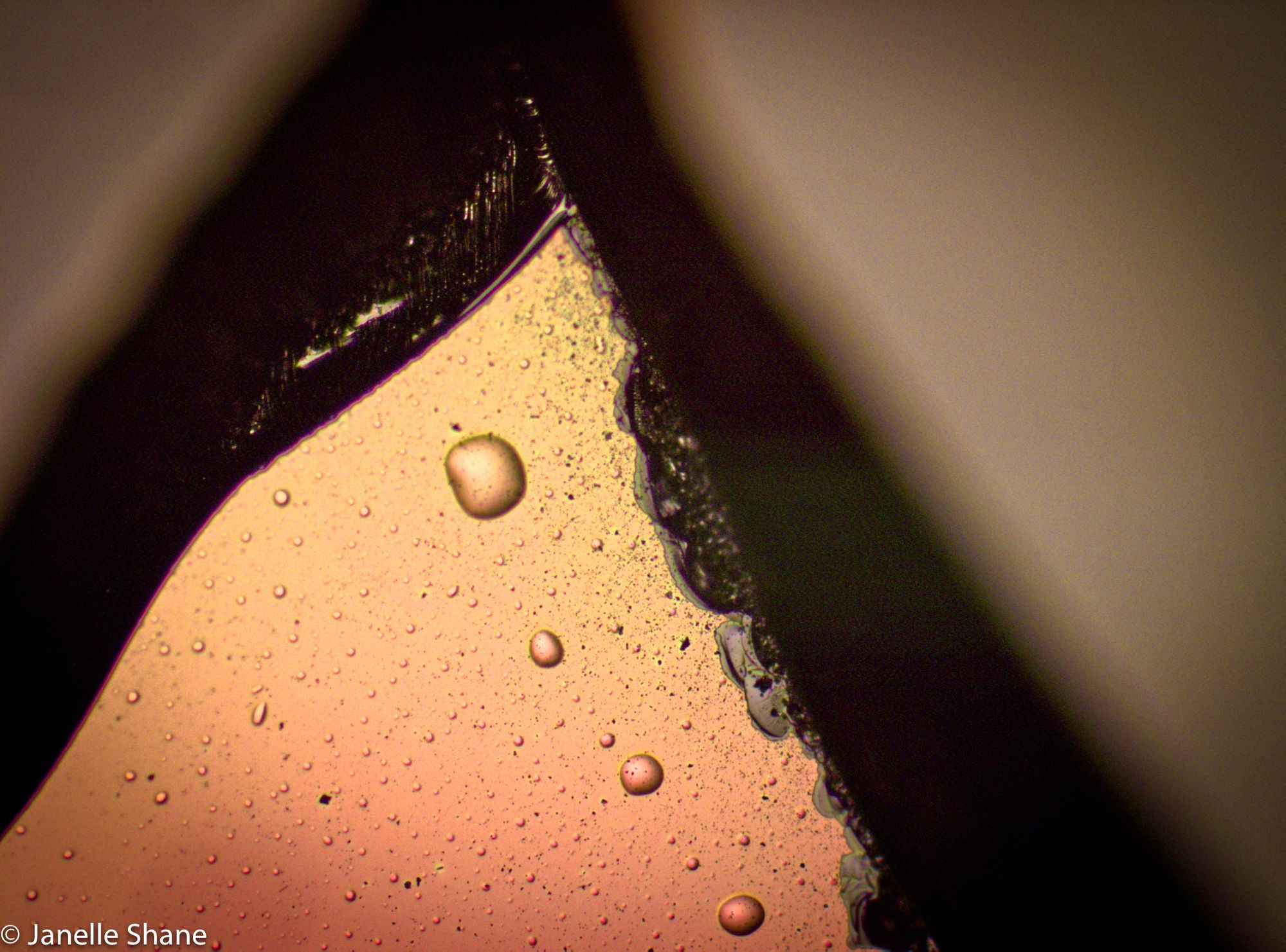 Thanks to the break, you can see all three materials this sample is made out of. The top layer - which is rainbow-colored due to its thinness - is semiconductor laser material. Beneath that in grey is silicon dioxide - good old glass. Finally at the bottom is a thick chunk of nearly-black silicon. I have no idea why it’s doing its impression of a frosty can of pop… those aren’t beads of condensation. I may find out when I go to look at this sample again with the electron microscope.
